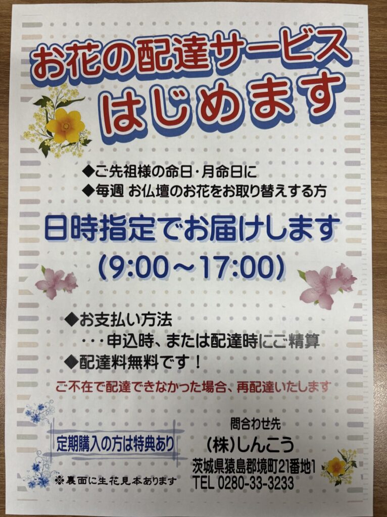 株式会社しんこうでは、年末年始の生花のご注文・配達を承っております。