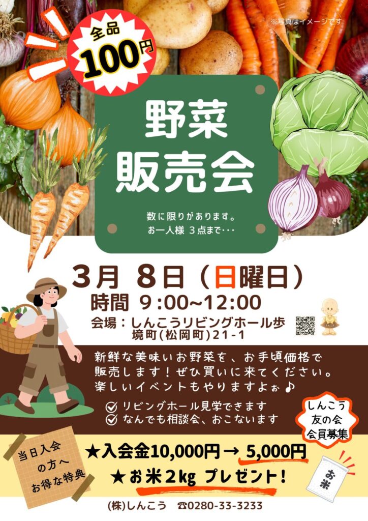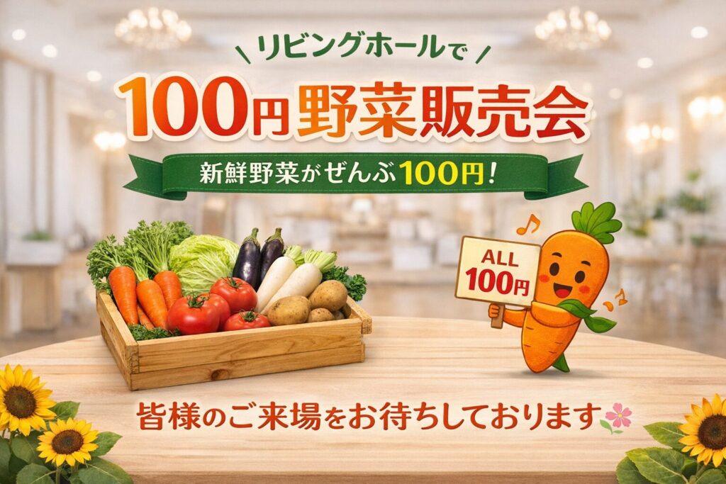 3/8、野菜販売会、100円均一開催! 2026年3月1日 最終更新日時 : 2026年3月1日 セレモしんこう リビングホールにて野菜の100円均一販売会を行います。 新鮮なお野菜をお手頃価格でご用意。どなたでもお気軽にお立ち寄りください。 ホール見学やご相談も可能です。皆さまのご来場をお待ちしております。 FacebookXBlueskyHatenaCopy